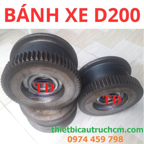 Bánh xe dầm biên cầu trục D200 là một bộ bánh xe cầu trục gồm 4 bánh, 2 bánh xe chủ động và 2 bánh xe bị động cộng 2 bánh răng con.